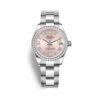 Rolex Datejust 278384RBR – Xuất hiện trong bộ vỏ Rolesor sang trọng, hiện đại được làm từ 2 chất liệu là vàng trắng 18k và thép không gỉ 904L độc quyền của thương hiệu Rolex, với kích thước 31mm vô cùng phù hợp với các quý cô văn phòng thời thượng và khí chất. Bên cạnh bộ vỏ, phiên bản được trang bị vành bezel được làm từ vàng trắng 18k được phủ kín bằng kim cương lấp lánh tạo điểm nhấn thú vị trên cổ tay của các quý cô, kết hợp núm điều chỉnh có hệ thống chống thấm nước hai tầng Twinlock mang tới khả năng chống nước ở mức 100m cực kỳ ấn tượng.