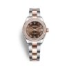 Rolex Datejust 279381RBR – Xuất hiện trong bộ vỏ Rolesor sang trọng, hiện đại được làm từ 2 chất liệu là vàng Everose 18k và thép không gỉ 904L độc quyền của thương hiệu Rolex, với kích thước 28mm vô cùng phù hợp với cổ tay của các quý cô hiện đại, tuy sở hữu kích thước khiêm tốn nhưng vẫn là một món phụ kiện không thể thiếu bên cạnh những bộ cánh sang trọng của các quý cô. Bên cạnh bộ vỏ, phiên bản được trang bị vành bezel được làm từ vàng Everose 18k được phủ kín bằng kim cương lấp lánh tạo điểm nhấn thú vị trên cổ tay của các quý cô, kết hợp núm điều chỉnh có hệ thống chống thấm nước hai tầng Twinlock mang tới khả năng chống nước ở mức 100m cực kỳ ấn tượng.