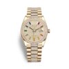 Rolex Day-Date 128348RBR – Xuất hiện trong bộ vỏ được làm hoàn toàn từ vàng vàng 18k nguyên khối, với kích thước 36mm vô cùng phù hợp với các quý cô và cả các quý ông có cổ tay khiêm tốn. Bên cạnh bộ vỏ, phiên bản được trang bị vành bezel được làm từ vàng vàng 18k được phủ kín bằng kim cương lấp lánh tạo điểm nhấn thú vị trên cổ tay của chủ nhân, kết hợp núm điều chỉnh có hệ thống chống thấm nước hai tầng Twinlock mang tới khả năng chống nước ở mức 100m cực kỳ ấn tượng.